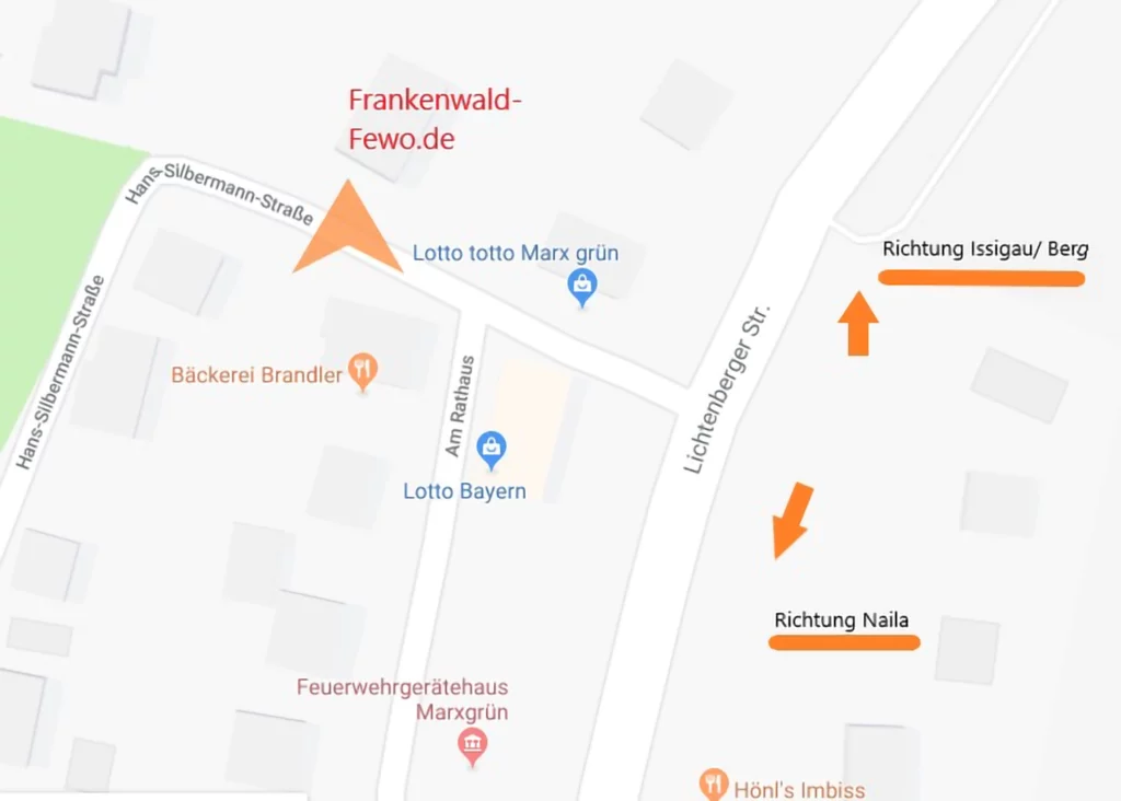 Von hier aus sind es ca 7 Gehminuten in Richtung Bad Steben/ Ortseingang Marxgrün. Nach dem Autohaus Räthel gehen Sie rechts Richtung Lichtenberg am Feuerwehrhaus vorbei (Gegenüber Imbiss) und biegen links in die Hans-Silbermann-Straße ab. Das grau-grüne Haus mit großem Balkon befindet sich direkt vor Ihnen.
